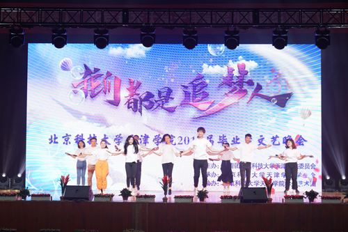 由共青團(tuán)北京科技大學(xué)天津?qū)W院委員會(huì),北京科技大學(xué)天津?qū)W院學(xué)生會(huì)承辦,北京科技大學(xué)天津?qū)W院藝術(shù)團(tuán)協(xié)辦的“我們都是追夢(mèng)人”北京科技大學(xué)天津?qū)W院2019屆畢業(yè)生文藝晚會(huì)于5月22日晚19:00在體育館隆重舉行。北京科技大學(xué)天津?qū)W院院長(zhǎng)王斌,黨委書(shū)記丁煦生,黨委副書(shū)記葉振楠、牛犁,財(cái)務(wù)總監(jiān)王俊敏,學(xué)術(shù)委員會(huì)主席宋存義,教務(wù)處處長(zhǎng)張建華,信息工程學(xué)院院長(zhǎng)許學(xué)東,圖書(shū)館館長(zhǎng)劉淑娥,外語(yǔ)系主任梁素芹,傳統(tǒng)文化研究院副院長(zhǎng)胡寶嘉,招生就業(yè)處處長(zhǎng)柯瑜,基建產(chǎn)業(yè)處處長(zhǎng)孟祥瑜,人事處常務(wù)副處長(zhǎng)王軍,學(xué)生處常務(wù)副處長(zhǎng)田勇,科研處副處長(zhǎng)、實(shí)驗(yàn)室管理中心副主任羅富臣,國(guó)際交流處副處長(zhǎng)張悅,后勤處副處長(zhǎng)劉杰,團(tuán)委書(shū)記殷實(shí)等嘉賓以及來(lái)自各院系畢業(yè)學(xué)子相聚一堂,暢敘畢業(yè)情誼。