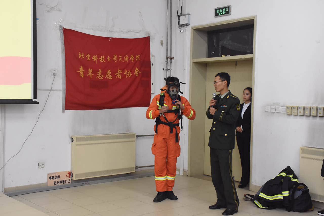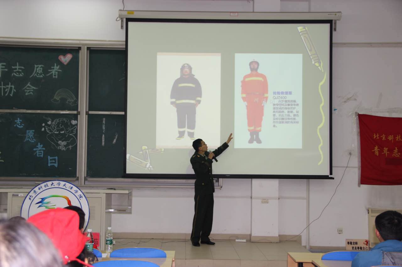 晚上六點半,9教108教室,消防安全知識講座在大家熱烈的掌聲中正式開始。在播放開場視頻之后,顧隊長開始了正式的演講。顧隊長的講解深入淺出,內容涉及火災發生的原因、怎樣預防火災、火場逃生基本知識、滅火器的正確使用以及如何正確報警等方面進行了生動講解。顧隊長不僅從理論上向大家傳授關于消防的各種安全防范知識,而且列舉了大量實際生活中的真實案例,教訓深刻,發人深省。戰斗班班長肖佳現場演示并教授學生消防服及配件的穿戴方法,并邀請了幾名同學親身試穿了消防官兵的戰斗服。穿著厚重的戰斗服,同學們體會到了消防官兵的不易,并且向消防官兵表達了敬意。最后以一段京津新城消防官兵冰上救人的英勇視頻結束了此次消防知識講座。