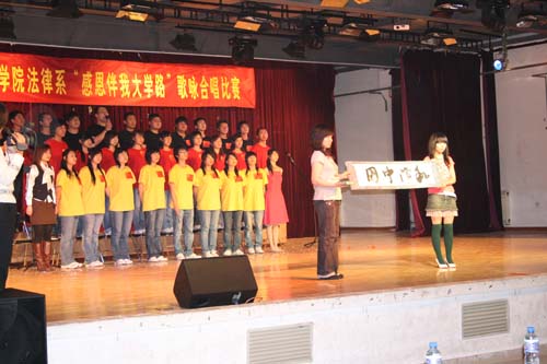 晚上7點,比賽正式開始,此次比賽以精神面貌、音樂表現、配合效果和形式創新為評分標準,參賽隊伍以現場書法、心型燭光、伴舞合唱、懸拉橫幅、朗誦等形式和造型演繹“感恩伴我大學路”的主題,《讓世界充滿愛》、《紅旗飄飄》、《明天會更好》等曲目傳達出了法律人感恩的心聲。感人動聽的歌聲,整齊統一的隊伍,熱情奔放的演唱使得比賽現場氣氛極其熱烈,不時傳出陣陣鼓掌。跳躍的音符抒發出參賽隊伍內心的喜悅,激昂的歌聲體現出法律人的颯爽英姿。經過精彩的表演、激烈的角逐,法學064班獲得了比賽的第一名,051班、071班并列第二名,065班、073班為第三名,051班和071班獲得精神文明獎,065班和075班獲得最佳創意獎。