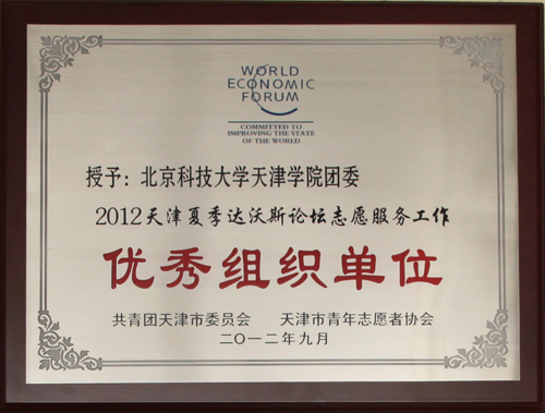 2012年夏季達沃斯論壇在天津梅江會展中心舉行。金沙城js93線路檢測中心7名青年志愿者按照論壇籌委會、團市委、市青年志愿者協(xié)會的要求,秉承“奉獻、友愛、互助、進步”的志愿精神,用自己的優(yōu)質(zhì)服務,向中外來賓展現(xiàn)了北京科技大學天津?qū)W院青年志愿者的良好服務形象和精神風貌,同時也得到了天津市相關部門的贊揚與肯定。最終,金沙城js93線路檢測中心團委被評為“2012天津夏季達沃斯論壇志愿服務工作優(yōu)秀組織單位”。