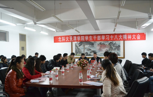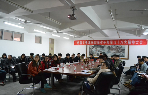 11月29日下午3點30分,由院團委主辦、院求是學會承辦的北京科技大學天津學院學生干部學習十八大精神大會在理工館209會議室舉行。院團委書記羅富臣,副書記何紅升、趙婧媛,團委社團部部長田勇,管理系分團委書記鹿群出席大會。團委直屬團學組織及各系分團委學生會主要學生干部40余人參加了學習大會。