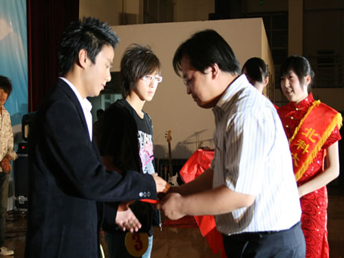 學生事務部主任盛佳偉為“校園十佳歌手”頒發獎杯和證書。
