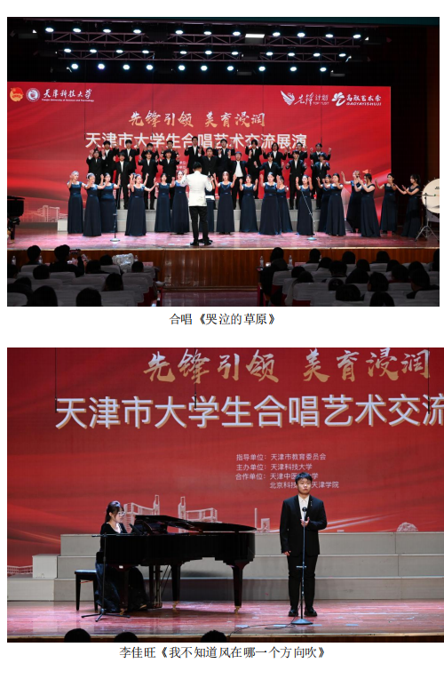 當天,天津科技大學濱海校區(qū)千人禮堂內(nèi)彌漫著濃郁的藝術氣息,在我校學生藝術團合唱團指導教師,崔帥老師的帶領下,我校學生合唱團演唱了在2024年天津市學校文藝展演中榮獲一等獎第一名的作品《哭泣的草原》,合唱團成員李佳欣、李昕宇、趙軍、楊凡帶來的四重唱《節(jié)日歡歌》,李佳旺、曲添歌演唱《我不知道風在哪一個方向吹》、《與你相見若如初》等膾炙人口的聲樂作品,將音樂會一次次推向高潮,團員們用歌聲展現(xiàn)了我校實施美育浸潤的高效成果。