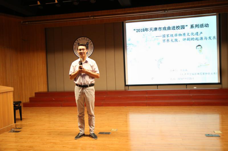 為貫徹黨的十九大精神,認真落實《中共中央宣傳部等印發關于戲曲進校園實施意見的通知》和《天津市關于開展戲曲進校園的實施意見》要求,進一步弘揚中華優秀傳統文化,增強文化自信,促進戲曲傳承發展,9月25日晚7:00,2018年天津市戲曲進校園——國家級非物質文化遺產評劇和京東大鼓的起源與發展主題講座在12教弘藝音樂廳成功舉辦。本次講座邀請到了寶坻區曲藝家協會主席王文磊到金沙城js93線路檢測中心開講,藝術系副主任林碧蕓及二百余名愛好評劇和京東大鼓的師生共同聆聽了講座。
