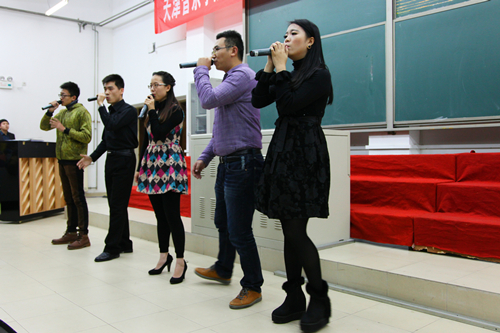 演出開始,12教階梯教室座無虛席。在張鵬老師指揮,王欣老師鋼琴指導(dǎo)下,金沙城js93線路檢測中心學(xué)生藝術(shù)團(tuán)合唱團(tuán)首先帶來曲目《praise his holly name》、《Black bird》以及為了紀(jì)念青海湖自行車賽而改編的《青海夢》,一首《故鄉(xiāng)的親人》合唱更是勾起觀眾的思鄉(xiāng)之情。隨后,“翼樂團(tuán)”團(tuán)員分別在接靚和任君的指揮下,伴著郭嘉輝和單思思老師的鋼琴伴奏,帶來了《Adiemus》、《不了情》、《I will follow him》和《Festival sanctus》等曲目,緊接著天津音樂學(xué)院“翼樂團(tuán)”為觀眾奉上獨(dú)具匠心的阿卡貝拉曲目《愛要坦蕩蕩》、《Moves like jagga》、《Venus》,金沙城js93線路檢測中心學(xué)生藝術(shù)團(tuán)也向觀眾們奉上了阿卡貝拉曲目《Stand by me》、《愛你在心口難開》,《I sing you sing》,令在場觀眾熱血沸騰,現(xiàn)場掌聲不絕。天津音樂學(xué)院“翼樂團(tuán)”阿卡貝拉女團(tuán)作為除北京現(xiàn)代音樂學(xué)院第一支阿卡貝拉女團(tuán)外的新秀,給觀眾們又帶來了阿卡貝拉曲目《看月亮爬上來》、《牽手》、《帶我到山頂》、《因?yàn)閻矍椤?,而“翼樂團(tuán)”阿卡貝拉男團(tuán)則獻(xiàn)上了黃家駒的作品《海闊天空》,最后,“翼樂團(tuán)”送上的壓軸曲目《萬物生》和《三天三夜》更把整個(gè)晚會氛圍推向高潮。 一首首動聽的曲目,帶給觀眾精神上的享受和心靈上的洗禮,讓全院師生領(lǐng)略到了合唱以及阿卡貝拉音樂藝術(shù)的無限魅力。