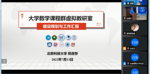 2022年7月13日,基礎部12個教科研小組的全體成員在范玉妹主任的帶領下,參加了北京科技大學舉辦的“大學數學課程群虛擬教研室”啟動會。此前,基礎部全體教師已加入北京科技大學大學數學課程群虛擬教研室。