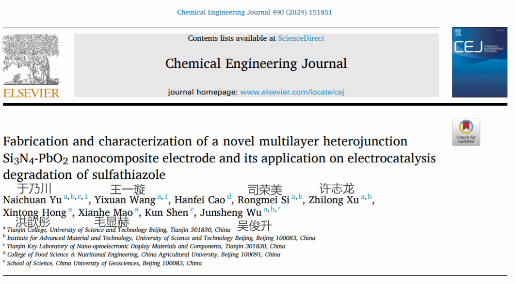 近日,我校材料與環境學院科研成果“Fabrication and characterization of a novel multilayer heterojunction Si3N4-PbO2 nanocomposite electrode and its application on electrocatalysis degradation of sulfathiazole(新型多層異質結結構Si3N4-PbO2電極的制備、表征及其電催化降解磺胺噻唑的應用)”在化工材料領域國際頂級期刊Chemical Engineering Journal(中科院一區期刊,影響因子15.1)上發表。材料系于乃川老師為論文第一作者,作者中還包括兩名參與項目的本科生(洪歆彤、毛顯赫)。該論文是在天津學院院長基金項目支持(項目編號No.2023YZJJ-KJ06)下產出的典型成果,也是我校首次以第一單位發表影響因子大于10.0的學術論文。