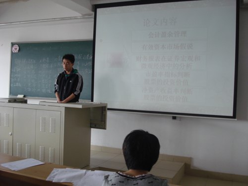 5月16日,管理系在9教進行06級會計和管信專業畢設中期答辯。管理系主任梁桂川教授、黨總支副書記張琦、06級學生畢業論文指導教師、06級學生輔導員遲鐵、馮海燕與會,管理系06級全體學生參加或觀摩答辯。