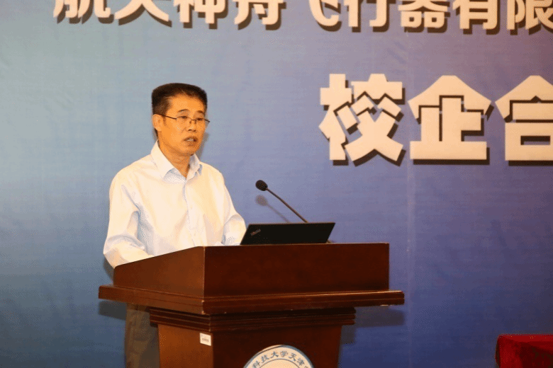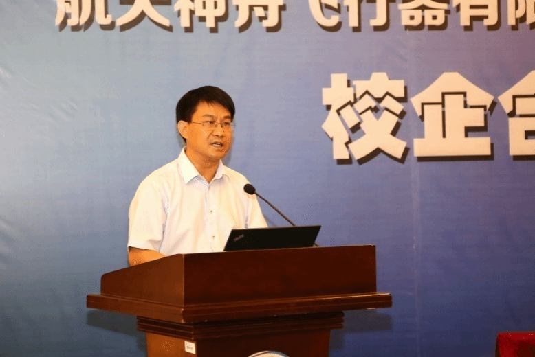 航天神舟飛行器有限公司副總經理周明致辭。他表示航天神舟飛行器有限公司是全國領先的無人機研制、生產、試驗試飛和技術服務企業。公司積極服務區域經濟發展,以市場需求為導向,打造市場引領、技術領先、體系完備、運營高效的軍民融合產業發展平臺。此次與天津學院開展合作共建,對推動無人機應用技術成果轉化具有重要意義,雙方將共同努力推動合作成果落地、落實。