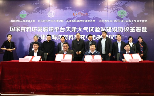 儀式上,國家材料環境腐蝕平臺主任李曉剛教授,京津新城管委會周振亮書記,北京科技大學天津學院黨委書記、院長王斌共同簽署了國家材料環境腐蝕平臺天津大氣試驗站建設協議。