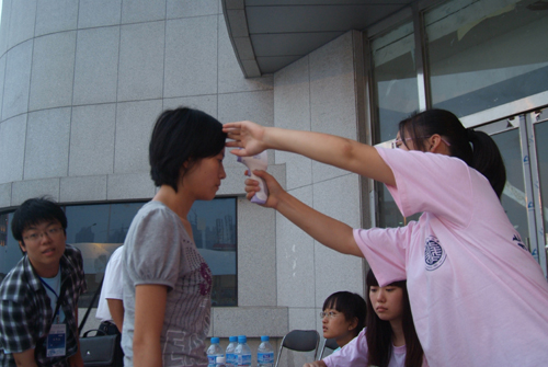 接站處備有體溫計(jì),在新生報(bào)到時(shí),學(xué)院迎新工作人員對新生進(jìn)行體溫測量,并做好詳細(xì)記錄,隨時(shí)關(guān)注新生的體溫狀況,并對甲型H1N1流感的預(yù)防、感染癥狀做了重點(diǎn)說明和指導(dǎo)。