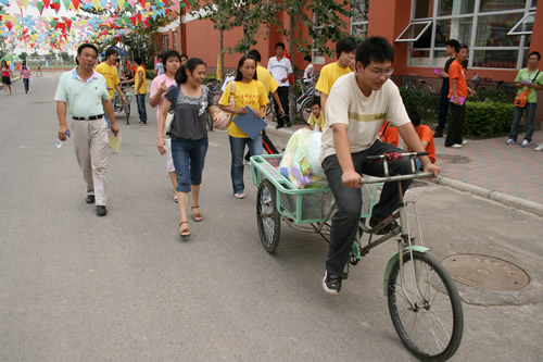 體育館里,各系的志愿者都笑容滿面地迎接捧著沉甸甸的通知書的新生們。館外,領軍訓服裝的地方,人也不會亞于報到處。隊伍一直延續到體育館門口。校園內的過道上,人流、車流也不少。在保安耐心地維護下,秩序井然。志愿者們分布在校園的每個角落,隨時隨地準備著為新生們服務。幫忙提行李、解答疑惑、指引道路、介紹情況,志愿者真誠的笑容讓新生面對這樣一個陌生的環境,消除了不適應,讓新生感受到回家的感覺。