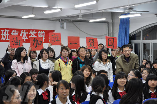在答辯現場,各班的“啦啦隊”以各種方式為班級加油。他們手拉班級條幅、齊聲高喊班級口號,為上臺答辯的同學加油鼓勁,充分展示了班級的凝聚力。整個答辯現場洋溢著輕松愉快的氣氛。