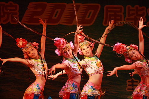 晚會(huì)以“云水約定”為主題,分為“云水記憶”和“約定未來(lái)”兩個(gè)篇章。本次畢業(yè)生文藝晚會(huì)舞臺(tái)設(shè)計(jì)新穎,在主舞臺(tái)前方延伸出正方形副舞臺(tái),在副舞臺(tái)兩側(cè)還安排2010屆畢業(yè)生觀眾,加強(qiáng)了表演者與觀眾的交流。隨著管弦樂(lè)合奏的徐徐響起,晚會(huì)正式拉開(kāi)帷幕。激情昂揚(yáng)的《加勒比序曲》,節(jié)奏歡快的《五聲神韻》,將現(xiàn)場(chǎng)觀眾的熱情充分調(diào)動(dòng)起來(lái)。熱烈的掌聲中,我們迎來(lái)了晚會(huì)的第一個(gè)節(jié)目歌伴舞《美麗的草原我的家》。演唱者行云流水般的歌聲,讓人感覺(jué)仿佛置身于草原之中,體驗(yàn)著那份清新與自然,享受草原的寧?kù)o。接下來(lái)是由學(xué)生藝術(shù)團(tuán)帶來(lái)的舞蹈《俏花旦》,它以中國(guó)傳統(tǒng)方式京劇為淵源,用不同于京劇表演的全新方式演繹而來(lái)。表演者動(dòng)作靈活敏捷,宛如一個(gè)個(gè)舞動(dòng)的精靈。