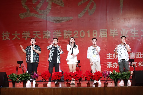 5月30日晚七點,“逐夢芳華”北京科技大學天津學院2018屆畢業生文藝晚會在體育館隆重舉行。北京科技大學天津學院黨委書記、院長王斌,黨委副書記白亮、葉振楠、孟菲菲,院長助理汪飛星,教務處處長張建華,信息工程學院院長許學東,學院辦公室主任郭雅娟,招生就業處處長柯瑜,招生就業處副處長羅富臣,人事處副處長王軍,城市建設學院黨總支書記孟祥瑜,學生處副處長田勇,機械系黨總支書記陳月,法律系黨總支書記馮海燕,外語系黨總支書記張莉,藝術系副主任林碧蕓,管理學院黨總支副書記周少華,經濟學院黨總支副書記閆謖,信息工程學院黨總支副書記夏華一和團委書記殷實等嘉賓以及來自各系畢業學子相聚一堂,暢敘畢業情誼。
