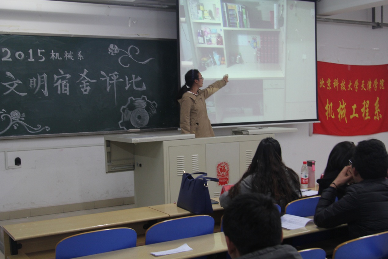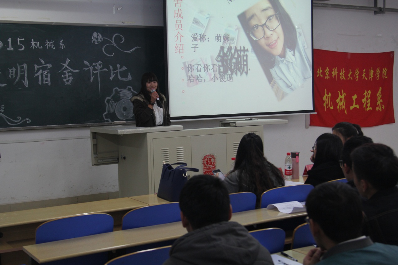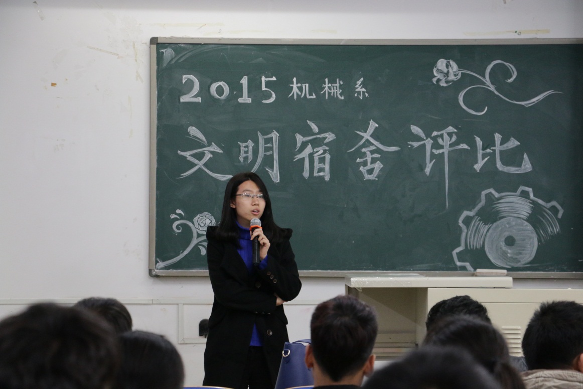 活動一開始,主持人介紹了此次文明宿舍評比活動是在系領導的指導下,經過系學生會生活部檢查、統計之后,從15級機械系的宿舍中選出了9個優秀宿舍進行本次評比。