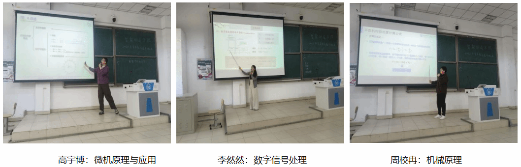 在比賽中,參賽的青年教師們儀態大方、從容自信,語言流暢,教學架構層層遞進,知識圖譜縱橫延展,多媒體課件與板書設計相映生輝,靈活調度教具等教學載體進行精彩的授課,生動詮釋了新時代青年教師銳意創新的精神風貌。其中,高宇博在《微機原理及應用》課程中,通過生活化案例與動態演示,將"有符號數的表示與運算"這一抽象知識點具象化,其邏輯縝密、深入淺出的講解贏得評委高度贊譽;李然然在《數字信號處理》課程中,以"數字濾波器的概念"為切入點,結合工程實例構建知識脈絡,展現了理論與實踐融合的教學智慧;周校冉則通過《機械原理》課程的"自由度計算"專題,以055驅逐艦為引,層層遞進激發學生思維,教學邏輯清晰,課堂掌控力突出。