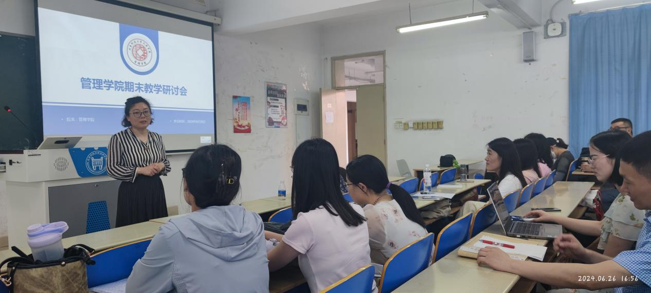 在新時代、新商科的背景下,為更好地提升應用型管理人才的培養質量,2024年6月27日管理學院在8教102開展了期末教學研討會,由管理學院副院長王曉欣老師主持。管理學院常務副院長王賓容老師以及管理學院教師參加了此次會議。