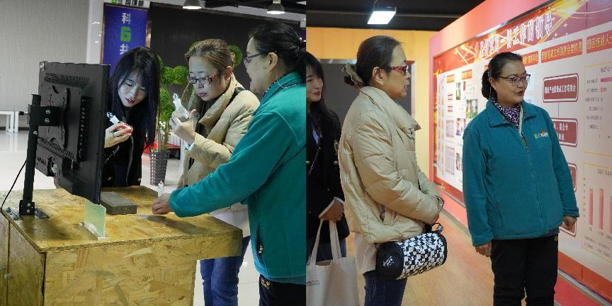 管理學院常務副院長王賓容和辦公室主任張媛老師在副書記張應軍的帶領下參觀了國創產業園區的科技應用成果展示,并在張書記的介紹下了解了園區的黨群服務中心和統戰工作站的建設情況。