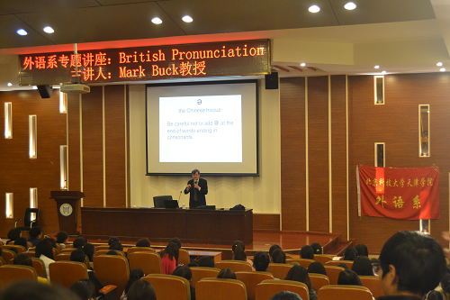 在講座開始之前的一段關(guān)于Mark Buck的簡短介紹后,Mark Buck教授就“British Pronunciation ”的主題教大家如何正確的發(fā)英音以及區(qū)分單詞的重音和輕音。在講解的過程中,教授就所講的內(nèi)容與同學(xué)互動,同學(xué)們都躍躍越試,受益匪淺。