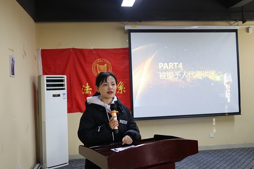 馮海燕老師發言。她對通過法考的同學們表示祝賀,并提出了三點希望:一是希望同學們以此次頒授儀式為契機,激勵法律系學子踏實學習,夯實專業基礎;二是希望同學們堅定信念,樹立自己的學習目標并為之奮斗。三是希望同學們能夠學有所成,為中國特色社會主義法治事業貢獻自己的力量。