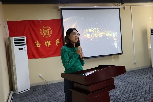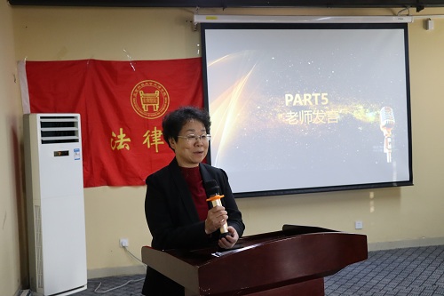 王蘭萍老師發言。她對通過法考的同學們表示祝賀,勉勵法律系2016級學子繼續努力,為同學們樹立榜樣,多分享經驗。希望同學們好好學習,天天向上。