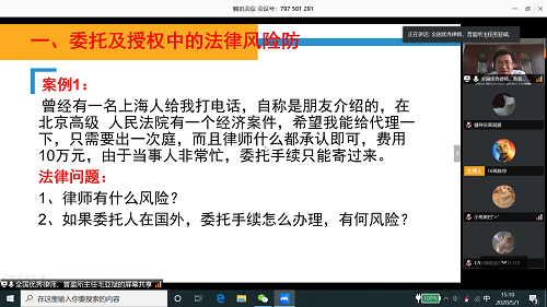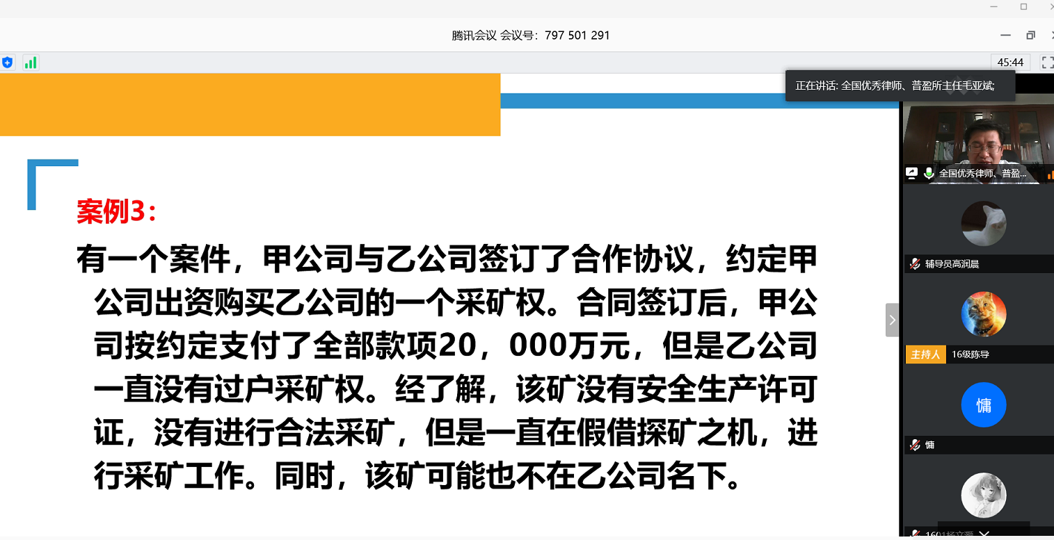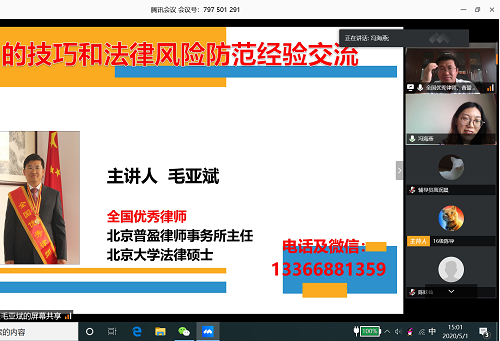 5月1日下午,全國優秀律師、北京普盈律師事務所毛亞斌主任為我系師生做了“訴訟技巧與訴訟法律風險防控”專題講座,法律系主任朱京安教授、黨總支書記馮海燕、專職教師和輔導員以及各年級學生,共計780余人參加本次在線講座活動,講座由黨總支書記馮海燕主持。