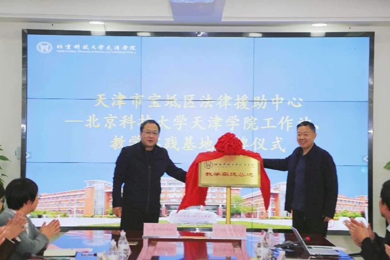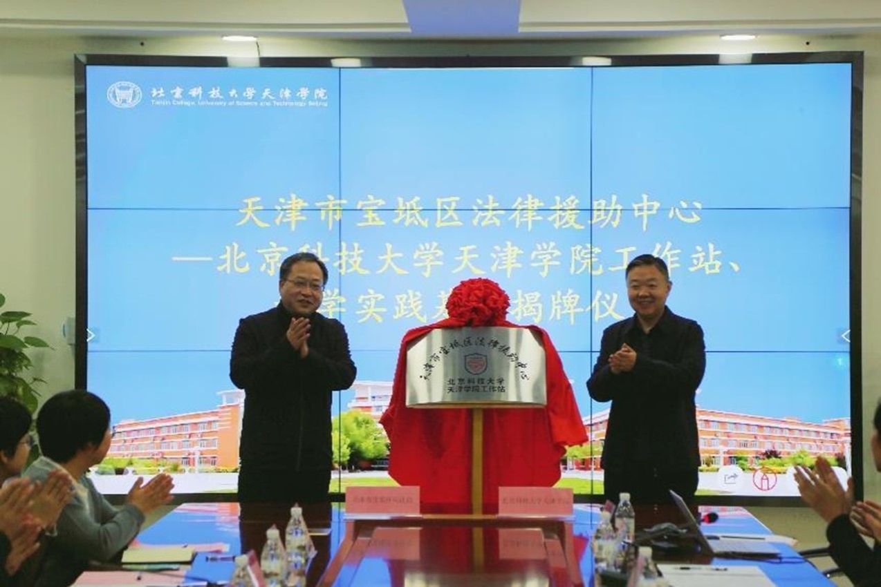 高萬通局長和丁煦生院長共同為“天津市寶坻區司法局法律援助中心-北京科技大學天津學院工作站”、“北京科技大學天津學院教學實踐基地”揭牌。