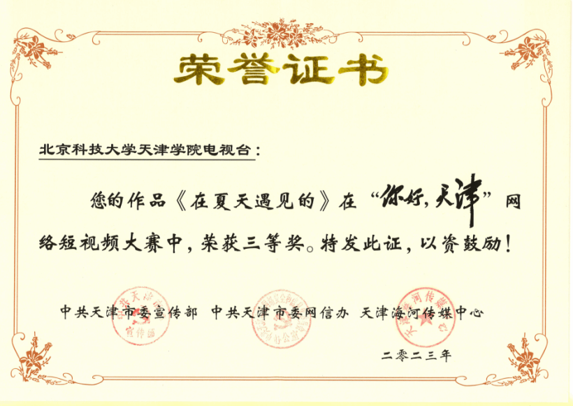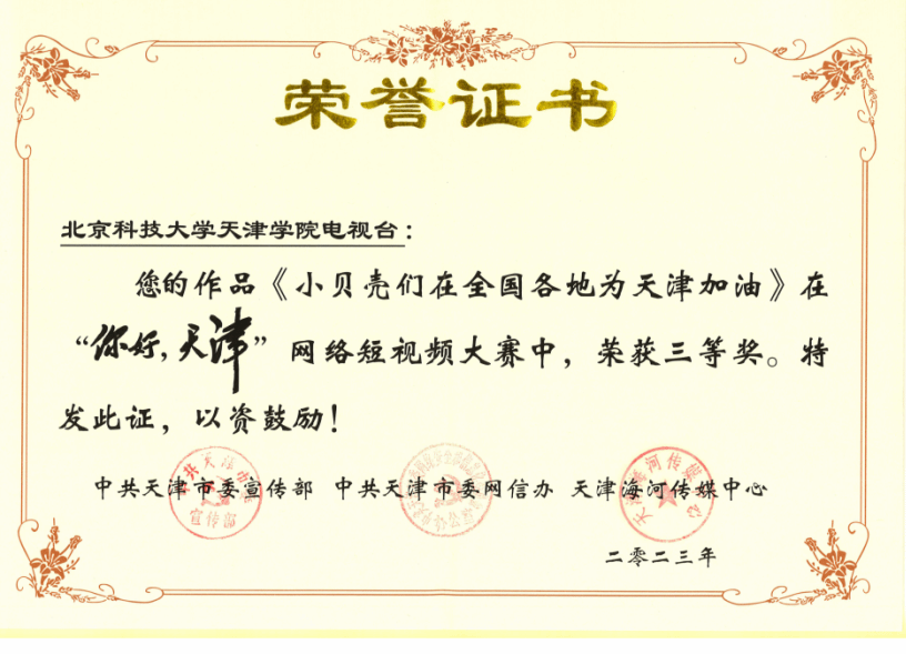 近期,由天津市委宣傳部、天津市委網(wǎng)信辦、天津海河傳媒中心聯(lián)合舉辦的“你好,天津”網(wǎng)絡(luò)短視頻大賽獲獎(jiǎng)結(jié)果揭曉。金沙城js93線路檢測(cè)中心電視臺(tái)《在夏天遇見(jiàn)的》、《小貝殼們?cè)谌珖?guó)各地為天津加油》、《結(jié)業(yè)典禮正版來(lái)啦》3部作品經(jīng)過(guò)激烈的角逐和比拼,突出重圍,在本屆“你好,天津”短視頻年度總決賽榮獲三等獎(jiǎng)佳績(jī)!