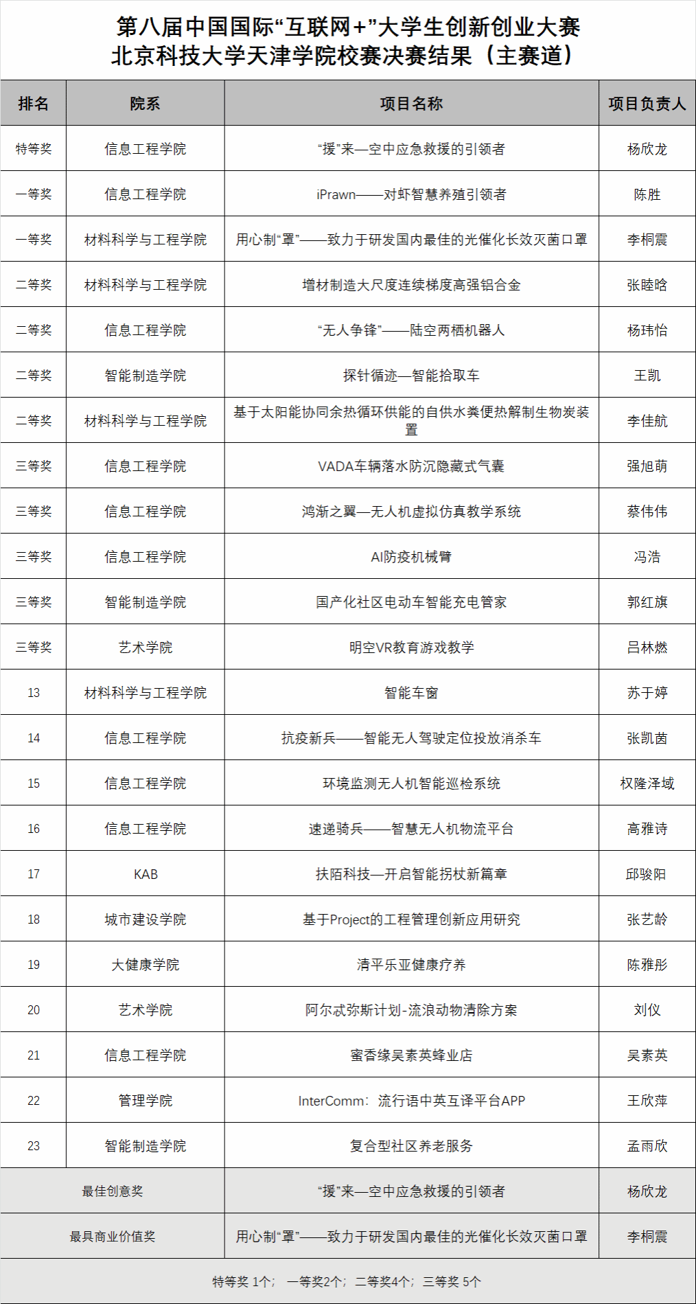 決賽開始后,現場33支創業團隊按照抽簽順序向評委介紹展示各自創業項目,評委對項目進展、商業模式、財務狀況、團隊組建和未來規劃等方面進行提問,參賽隊員限時回答,之后評委給出分數。經過激烈角逐,評選出主賽道特等獎 1個,一等獎2個,二等獎4個,三等獎 5個;紅旅賽道一等獎 1個,二等獎1個,三等獎3個。17個校級優秀項目將擇優推薦參加第八屆中國國際“互聯網+”大學生創新創業大賽天津賽區比賽。