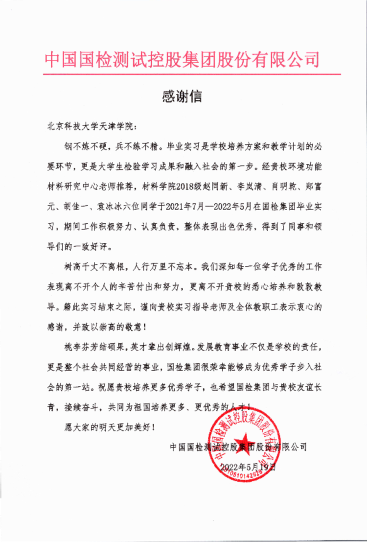 5月19日,金沙城js93線路檢測中心收到來自中國國檢測試控股集團股份有限公司(國檢集團)的感謝信,信中對金沙城js93線路檢測中心材料系六名在該集團參加畢業(yè)實習(xí)學(xué)生的優(yōu)秀表現(xiàn)給予了高度評價,對學(xué)院的應(yīng)用型人才培養(yǎng)模式給予了積極肯定,對學(xué)院老師們表...