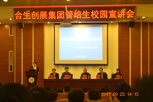 9月23日下午14:00,合生創展集團在我校舉辦了合生創展集團管培生校園宣講會,出席宣講會的有合生創展集團陳楚強、閆兵、滕懷山,土木工程系主任劉勝富,土木工程系黨總支書記孟祥瑜。 講座上,合...