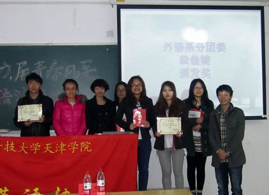 2015年10月13日晚19:00,由北京科技大學天津學院外語系分團委承辦的“外研社杯”英語演講大賽在8教102如期舉行。外語系分團委書記王研,外語系輔導員王為,外語系教師陳元元、高子琳、李玲一作為大賽的評委老師出席...