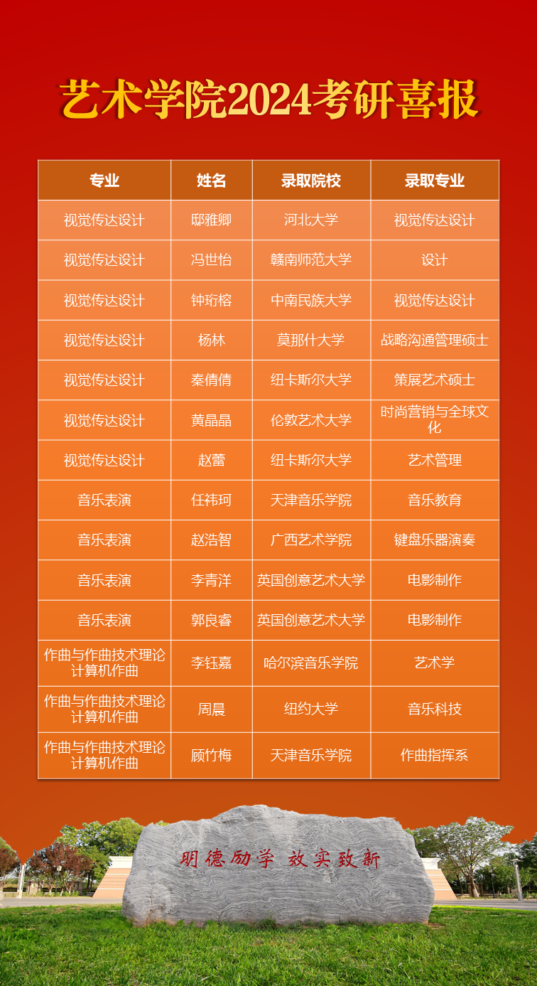 日前,2024年全國碩士研究生招生考試錄取結(jié)果陸續(xù)公布,藝術(shù)學(xué)院考研學(xué)子捷報頻傳,2024屆畢業(yè)生中,共有14名學(xué)生被順利錄取,其中國內(nèi)高校7所,國外高校7所。 多年以來,藝術(shù)學(xué)院始終將本科生考研作為強化學(xué)風(fēng)建設(shè)...